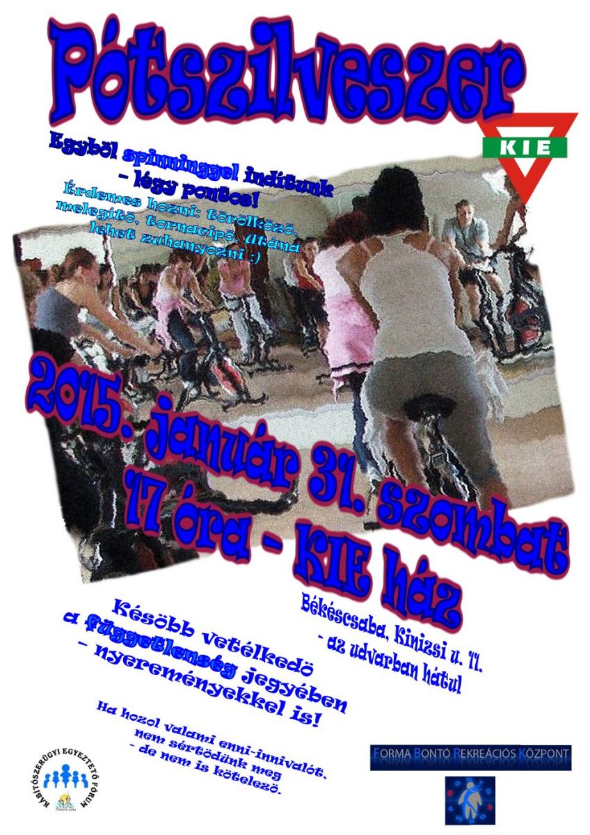 Január 31. szombat. 17 óra, KIE ház. Partnerünk a Forma Bontó Rekreációs Központ - úgyhogy egyből spinninggel kezdjük a programot - légy pontos! Érdemes hozni: törölköző, melegítő, tornacipő. Utána lehet zuhanyozni :)