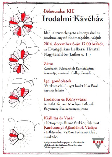 Idén is szívmelengető élményekkel és torokmelengető finomságokkal 2014. december 6-án 17.00 órakor, az Evangélikus Lelkészi Hivatal Nagytermében (Békéscsaba, Luther u. 1.) Irodalmi Kávéház: