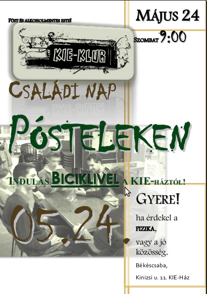 Ezen a szombaton 9:00 órakor indulunk a KIE házból, Póstelekre. És ott leszünk. Estig, vagy ameddig jól érezzük magunkat.