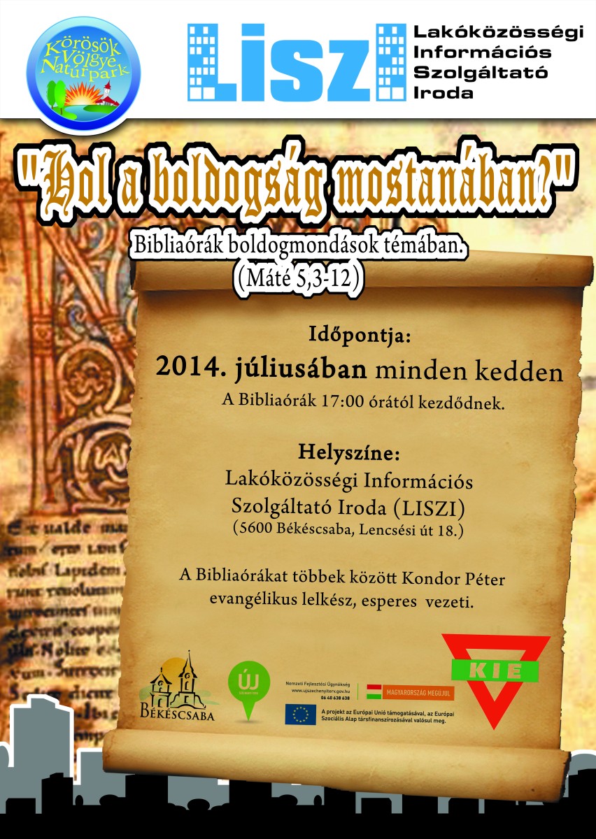 2014 júliusában keddenként 17 órától bibliaórák. Békéscsabán, a Lencsésin (18. szám) a LISZI szervezésében. Részletek a plakáton.